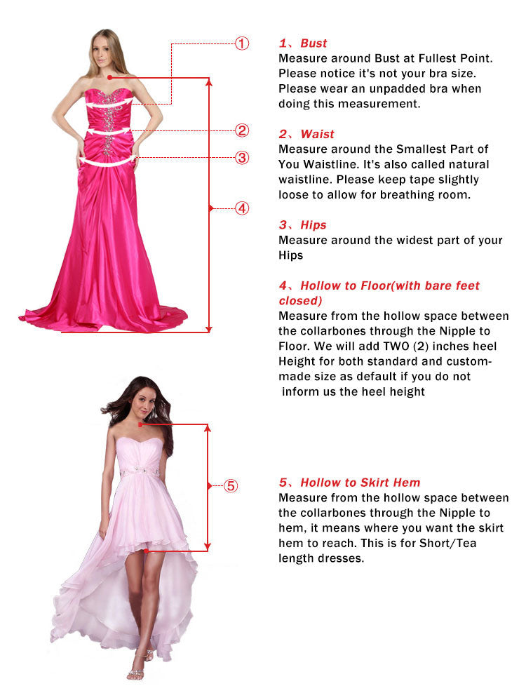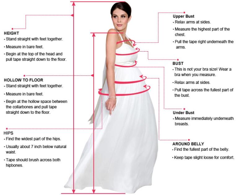 Perfect-fitting Dress shows your Charming Figure! Perfect-fitting dress starts with correct measurements. Before custom-made your own dress, we recommend you to find a professional local tailor who can help you measure accurately. But you can certainly get a close approximation handling the measuring tape yourself. The measurements that you definitely need are your chest, waist, hips, and hollow to floor. Knowing how to measure waist and hips is common knowledge, but some women do not know exactly where to start / stop the measurement for a more accurate result. And, we need the measurements below and how to take them correctly.